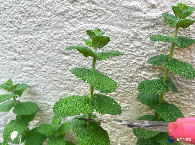 허브 수확 Tip : 잎이 나온 곳을 자세히 살펴보면 작은 잎들이 아기자기하게 자라고 있을 것입니다. 귀여운 작은 잎들을 가까이 자르되, 잎이 다치지 않도록 조심스럽게 수확해 줍니다. 잘 수확하면 두 개의 새 가지가 자라는 것을 확인할 수 있습니다.