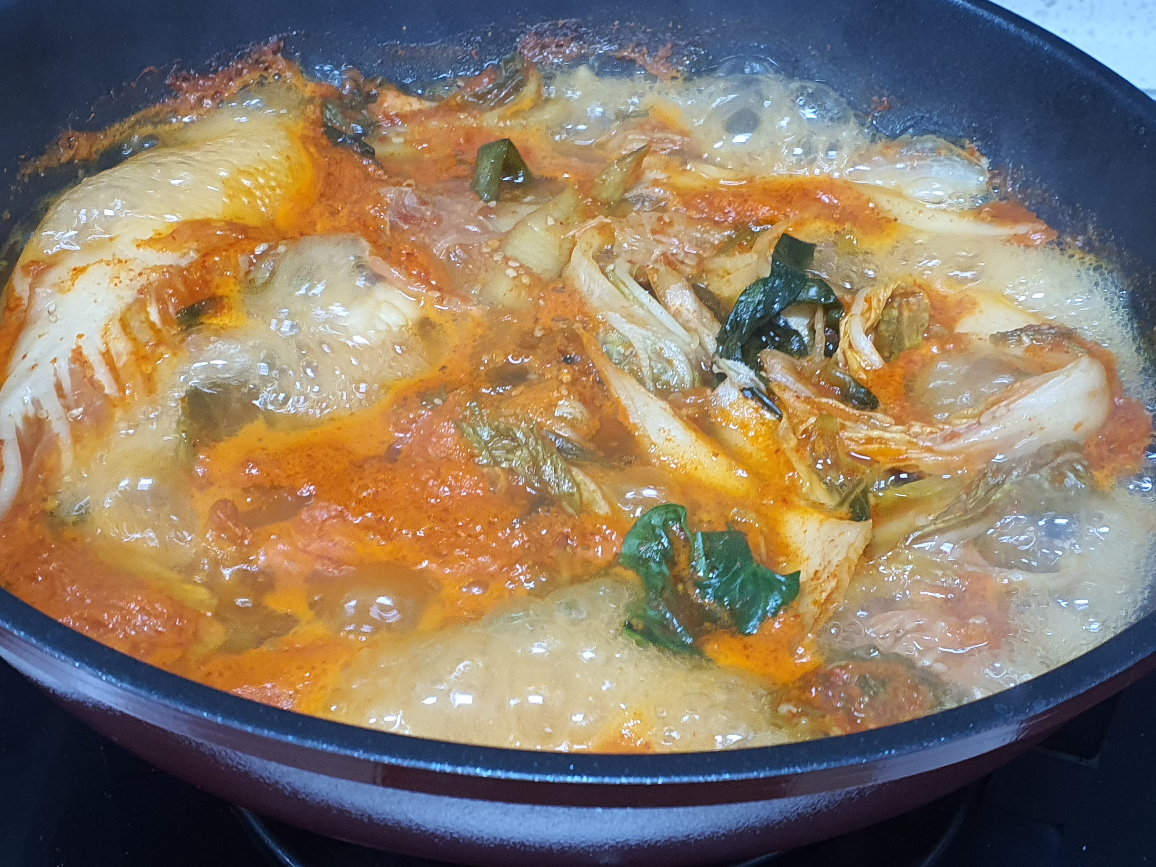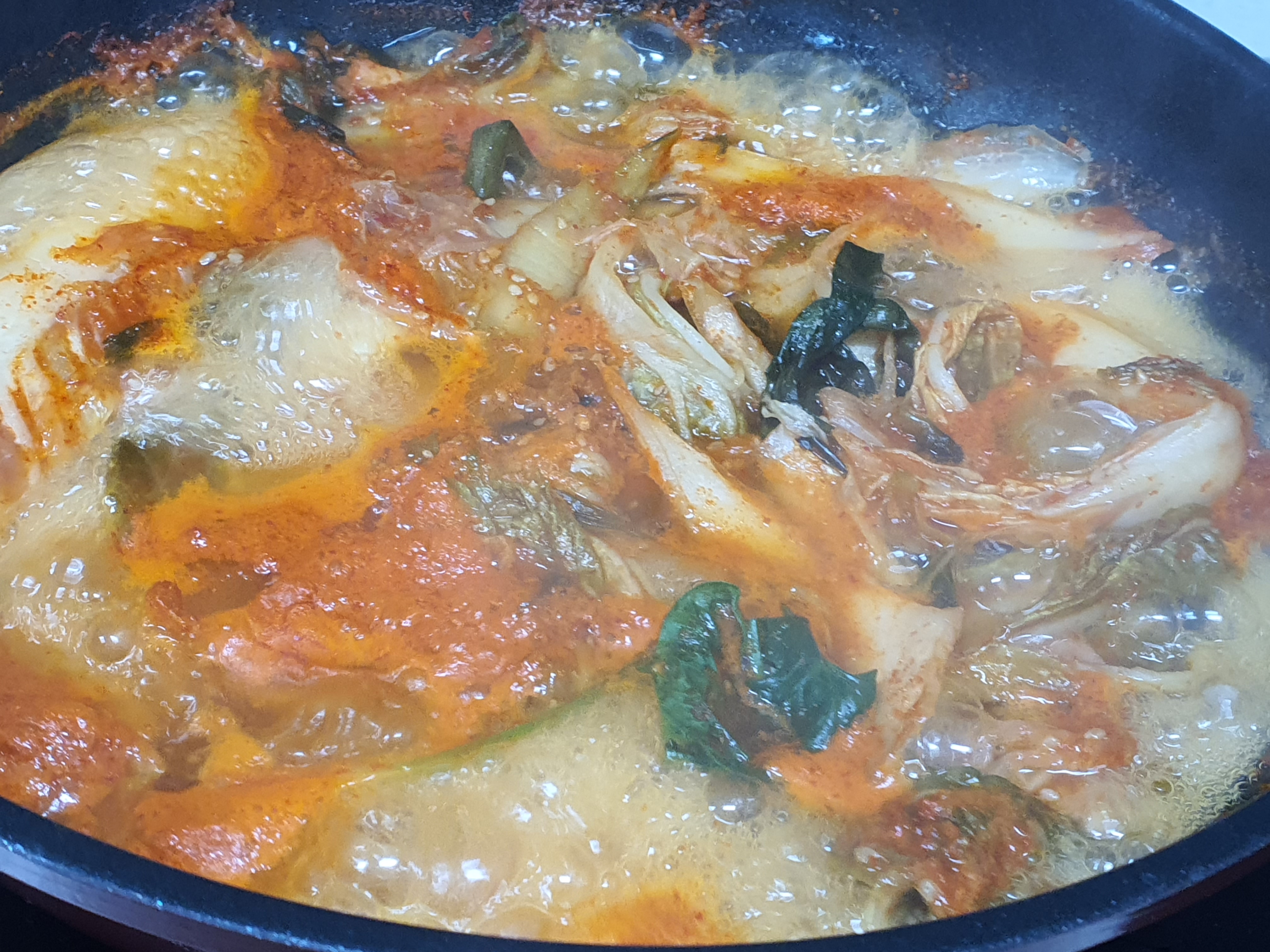 2. 김치가 어느정도 익으면 청국장 빼고 남은 모든 재료와 양념을 넣습니다. 그리고 물도 더 채워 넣어줍니다. 보통은 쌀뜸물을 넣기도 하지만, 저흰 이미 밥을 한 상태라 패스~^^