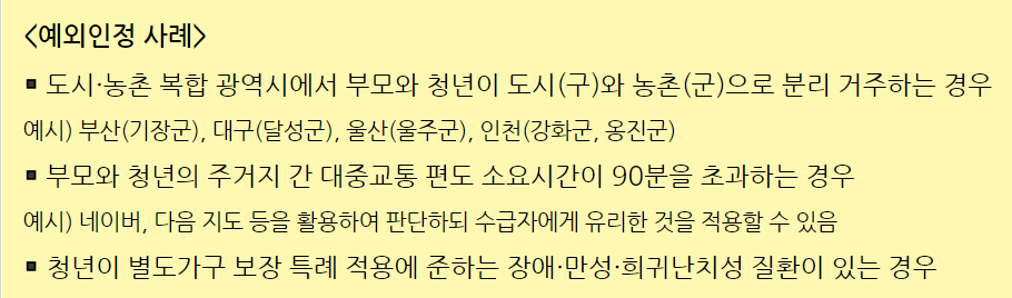 다만, 동일 시·군이라 하더라도 대중교통의 이용가능성 및 소유시간, 청년가구원의 신체적 장애 등 그 밖의 부득이한 사유가 있는 경우 예외로 인정 가능합니다.