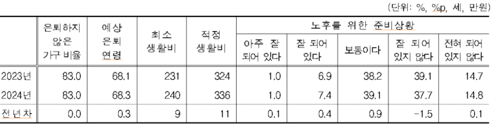 그런데 많은 이들이 행복한 노후를 제대로 준비하지 못하고 있는 것으로 나타났다고 합니다. 통계청에 따르면 올해 3월 말 기준 은퇴하지 않은 가구주가 생각하는 예상 은퇴 연령은 68.3세였지만, 실제 은퇴한 연령은 62.8세로 나타났다고 합니다. 예상보다 5.5년이나 빠르게 은퇴를 맞이하는 것입니다. 은퇴 후 적정 생활비는 월평균 336만 원, 최소 생활비는 240만 원으로 조사됐다고 합니다. 은퇴 후 병원비 등 예상 밖의 지출이 증가해 이 정도의 생활비가 필요하다는 것입니다.