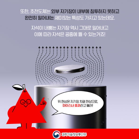 또한, 초전도체는 외부 자기장이 내부에 침투하지 못하고 완전히 밀어내는 재미있는 특성도 가지고 있다고 합니다.