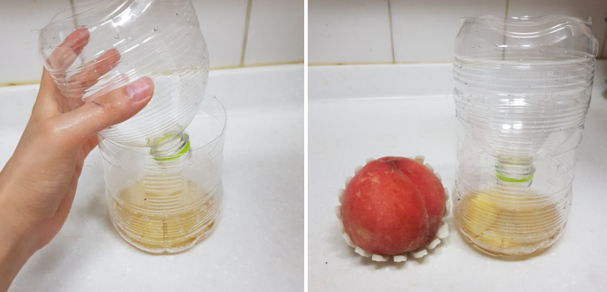 재료를 모두 섞었다면 잘라놓은 페트병의 입구 부분을 거꾸로 끼워줍니다. D.I.Y 초파리 트랩 만들기가 완성되었습니다.