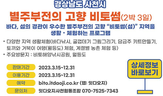 이 밖에도 국악과 와인이 함께하는 영동군 풍류스테이, 사천시의 별주부전의 고향 비토썸, 모주 만들기 체험이 가능한 반반 전주 등 다양한 여행 프로그램들이 마련되어 있습니다. 자세히 살펴보고 취향에 따라 선택하면 될 것 같습니다. 위 프로그램은 숙박, 조식, 체험비 등을 포함해 정상가보다 할인된 가격에 제공한다고 하니, 알뜰 여행하시면 좋을 것 같습니다.