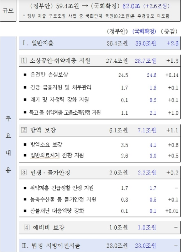 국회 심사 과정에서 추경 규모는 62조 원으로 늘어납니다. 이는 정부안이 59조 4000억 원보다 2조 6000억 원 늘어난 수준으로 역대 최대 규모입니다.