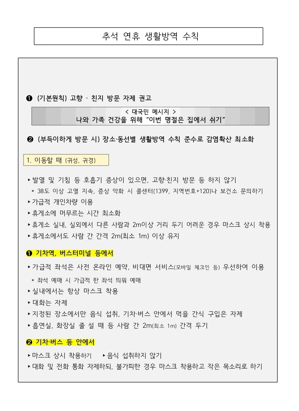 추석특별방역 : 사회적 거리두기 2단계의 핵심 조치를 그대로 이어가기