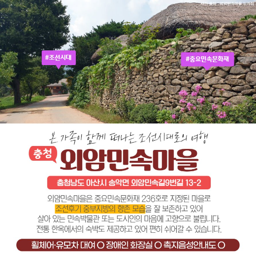 외암민속마을은 중요민속문화재 236호로 지정된 마을로 조선후기 중부지방의 향촌 모습을 잘 보존하고 있어 살이 있는 민속박물관 또는 도시인의 마음에 고향으로 불립니다. 전통 한옥에서의 숙박도 제공하고 있어 편히 쉬어갈 수 있습니다.