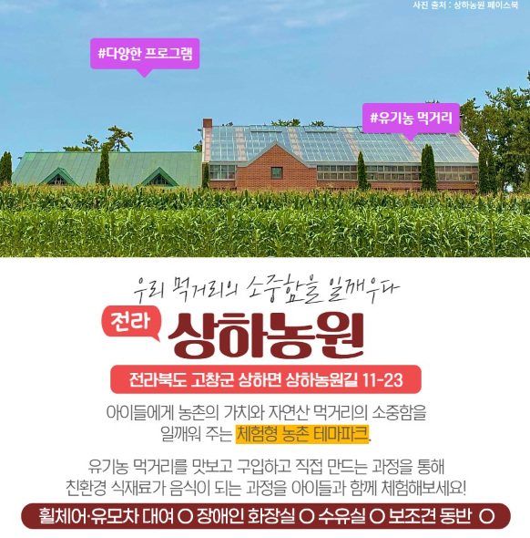 아이들에게 농촌의 가치와 자연산 먹거리의 소증함을 일깨워 주는 체험형 농촌 테마파크와 유기농 먹거리를 맛보고 구입하고 직접 만드는 과정을 통해 친환경 식재료가 음식이 되는 과정을 아이들과 함께 체험해 보세요!