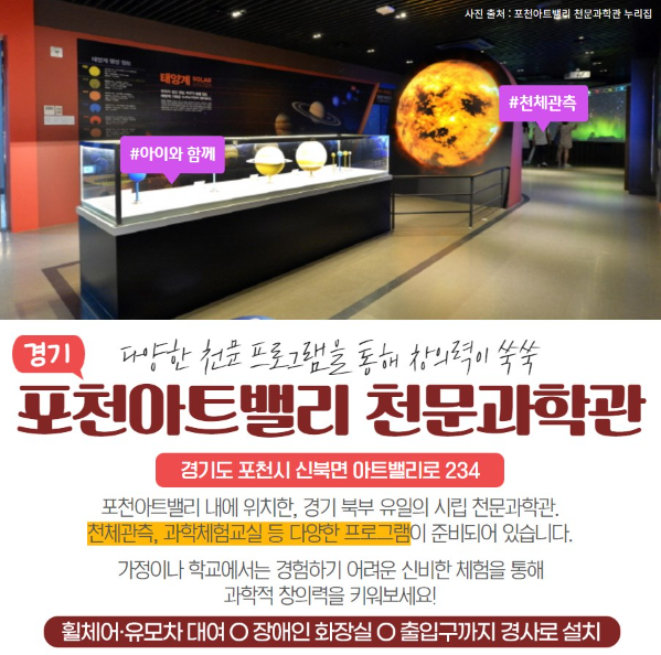 포천아트밸리 내에 위치한, 경기 북부 유일의 시립 천문과학관·천체관측, 과학체험교실 등 다양한 프로그램이 준비되어 있습니다. 가정이나 학교에서는 경험하기 어려운 신비한 체험을 통해 과학적 창의력을 키워보세요!