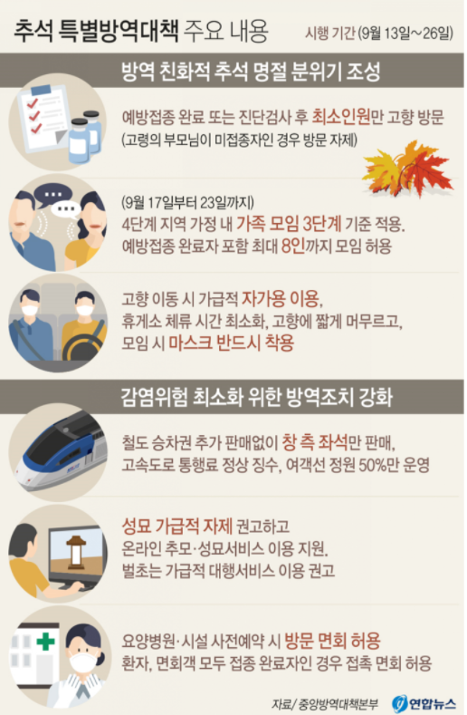대규모 인구 이동에 대비해 고향 방문 자제, 온라인 성묘 등 관련 방역 조처를 강화하면서도 백신 접종자에 한해서는 사적모임 인원 기준을 다소 완화한 것이 특징이라고 합니다.