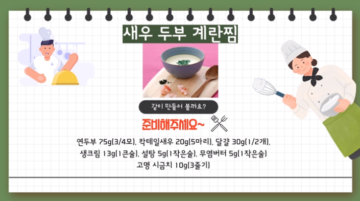 연두부 3/4모, 칵테일새우 5마리, 달걀 1/2개, 생크림 1큰술, 설탕 1작은술, 무염버터 1작은술, 고명 시금치 3줄기