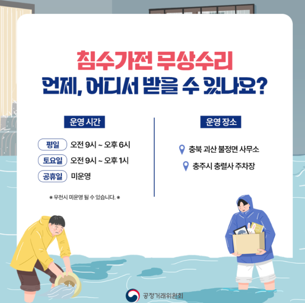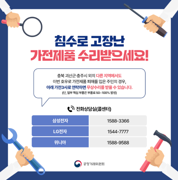 이에 행정안전부는 호우 피해 지역 주민들의 빠른 일상 회복을 위해 삼성전자, LG전자, 위니아 등 가전 3사와 협력하여 가전제품을 무상으로 수리해 드리는 '가전 3사 합동무상수리팀'을 운영한다고 합니다.