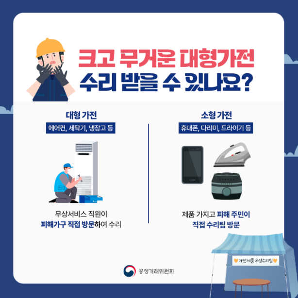 핸드폰, 다리미, 드라이기 등 옮길 수 있는 소형 가전의 경우, 피해 주민이 제품을 가지고 가까운 합동 수리팀 운영 장소를 직접 방문하면 무상수리를 받을 수 있습니다.