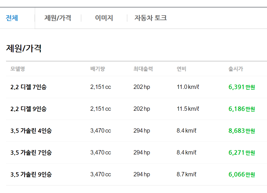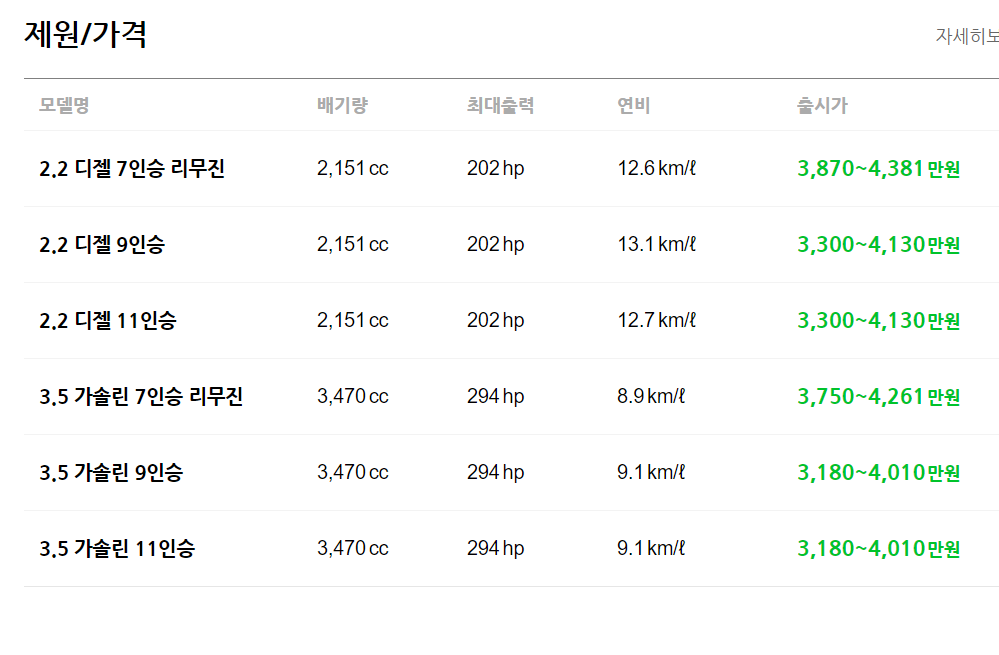 7인승은 가솔린 모델 노블레스 3,848만원, 노블레스 아웃도어 3,750만원, 시그니처 4,261만원이며, 디젤 모델 노블레스 3,966만원, 노블레스 아웃도어 3,868만원 시그니처 4, 378만원 이라고 합니다.(개별소비세 3.5%기준)