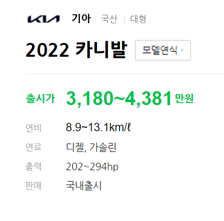 The 2022 카니발의 판매 가격은 9인승/11인승 가솔린모델, 프레스티지 3,180만원, 노블레스 3,615만원, 시그니처 4,010만원, 디젤 모델, 프레스티지 3,300만원, 시그니처 4,130만원 이라고 합니다.(9인승 이상 개별소비세 비과세 대상)