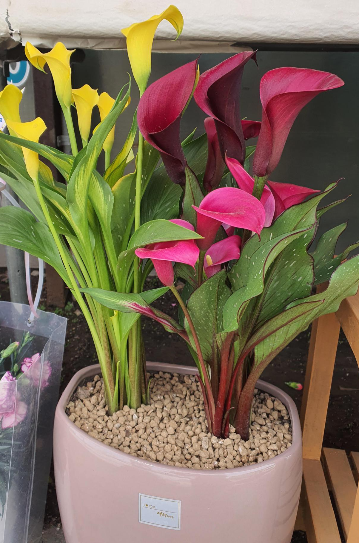 카라는 2가지로 분류할 수 있는데, 흰색 카라꽃은 습지형이고 노란색, 오렌지색, 핑크, 보라등의 색깔의 카라는 건지형이라고 합니다.