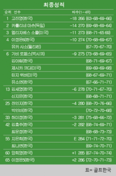 이번 대회에서 고진영은 1~4라운드 각각 63-68-69-66타를 적어 냈다고 합니다.