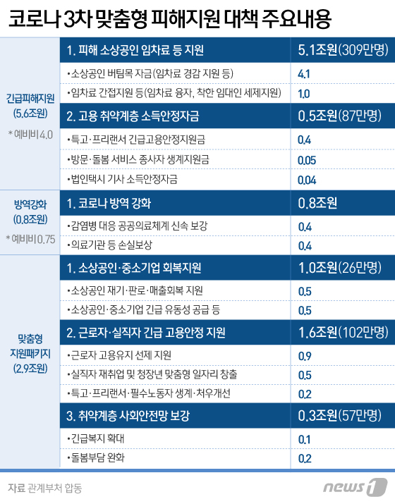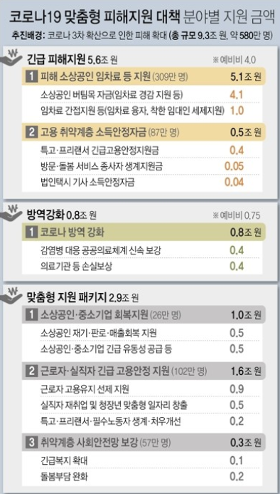 3차 재난지원금으로 불리는 맞춤형 피해지원 대책은 크게 소상공인(최대 300만원), 특고·프리랜서(최대 100만원), 방문돌봄 종사자와 방과후 강사(50만원), 법인 택시기사(50만원) 등으로 지원대상이 나뉜다고 합니다.