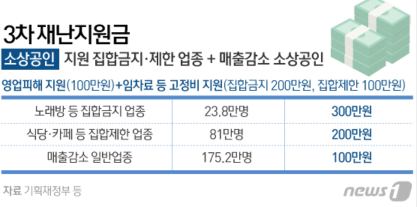 집합금지 업종에는 300만 원(거리두기 강화로 아예 영업을 하지 못한 학원이나 실내체육시설, 노래연습장 등 23만8천 명)이고,