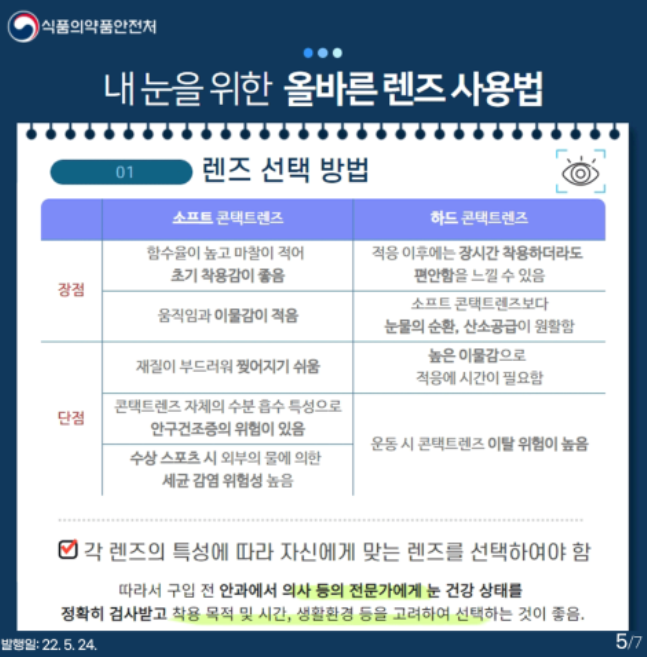 따라서 구입 전, 안과에서 의사 등 전문가에게 눈 건강 상태를 검사받고 착용 목적과 시간, 생활환경 등을 고려해 렌즈를 선택하는 것이 좋습니다.