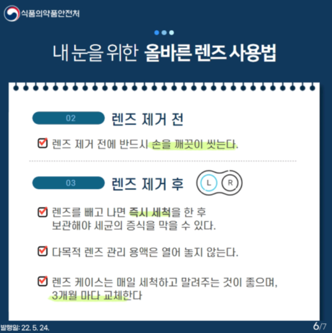 이처럼, 몇 가지만 기억하고 실천한다면 콘택트렌즈의 위험성으로부터 우리의 눈 건강을 보호할 수 있습니다. 콘택트렌즈의 올바른 사용법이 우리의 눈 건강을 지킬 수 있습니다.