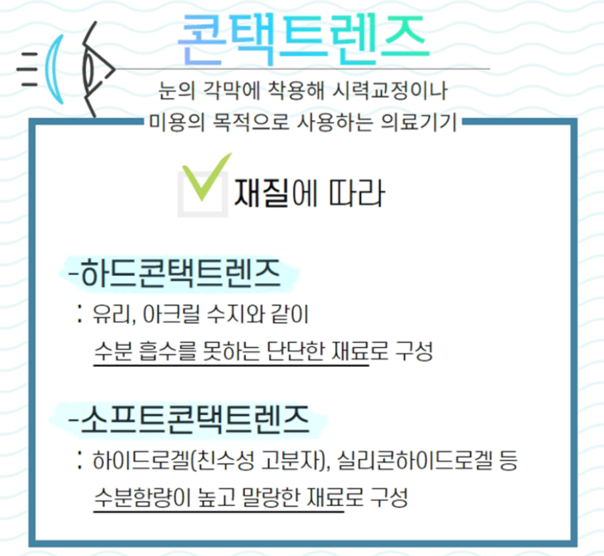 콘택트렌즈는 재질에 따라 소프트콘택트렌즈와 하드콘택트렌즈로 나뉩니다. 이름처럼 수분함량이 높아 말랑한 재질인 것이 '소프트콘택트렌즈'이고 수분흡수를 못 하는 단단한 재료로 만들어진 것이 '하드콘택트렌즈'입니다.