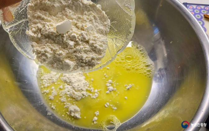 2. 달걀을 곱게 풀어 물 1/2, 부침가루를 넣고 섞어줍니다.