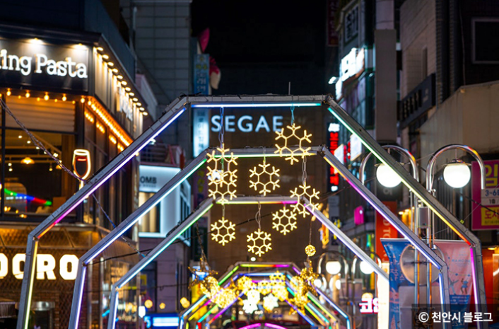 매년 12월, 천안에서는 세계크리스마스 축제가 펼쳐진다고 합니다. 올해는 신부문화거리 일대가 로맨틱한 분위기로 물들었다고 합니다. 어두운 하늘을 환하게 밝히는 형형색색의 조명들이 인상적입니다.