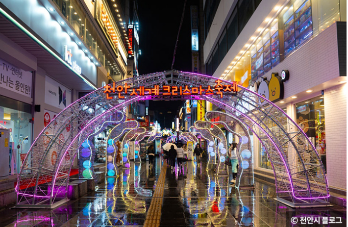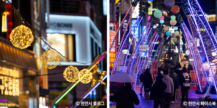 매년 12월, 천안에서는 세계크리스마스 축제가 펼쳐진다고 합니다. 올해는 신부문화거리 일대가 로맨틱한 분위기로 물들었다고 합니다. 어두운 하늘을 환하게 밝히는 형형색색의 조명들이 인상적입니다.
