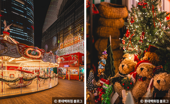잠실 롯데월드몰 크리스마스 마켓은 멀리서부터 단번에 눈을 사로잡는 대형 크리스마스 트리는 물론이고 회전목마가 있어 낭만을 더해준다고 합니다.