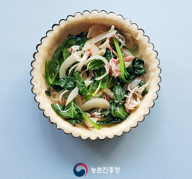 타르트 틀에 볶은 재료들과 토마토를 잘 펼쳐서 넣어주고, ④에서 잘 섞어놓은 아파레유를 부어줍니다.