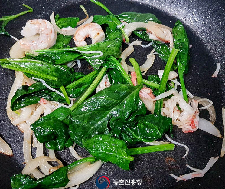 양파, 시금치, 새우를 기름을 두른 팬에서 볶아줍니다.