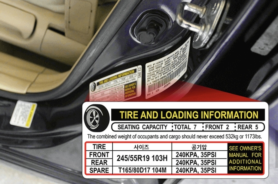 타이어를 교체하기로 마음 먹었다면 내 차의 타이어 사이즈를 알아야 그에 맞는 타이어를 구매할 수 있습니다. 내차의 타이어 사이즈를 알아보는 방법은 생각보다 간단합니다. 운전석 도어와 맞닿는 부분에 부착되어 있는 타이어 정보 스티커를 보면 됩니다. 해당 스티커에는 내 차의 타이어 사이즈는 물론 전륜과 후륜의 적정 공기압을 한 번에 볼 수 있습니다.