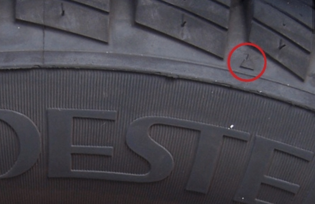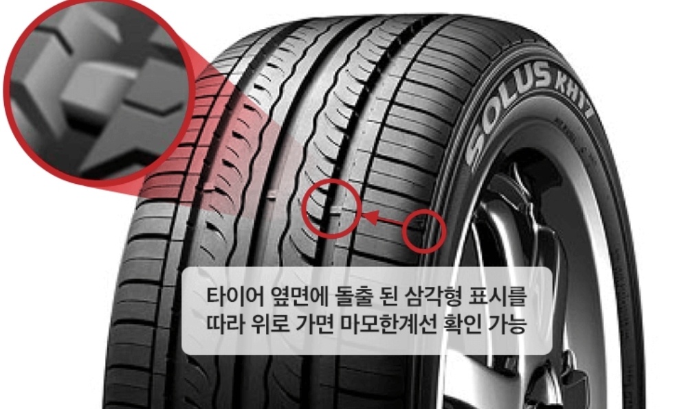 타이어 옆면에 돌출된 삼각형을 따라 위로 올라가면 마모한계선을 쉽게 찾을 수 있습니다.