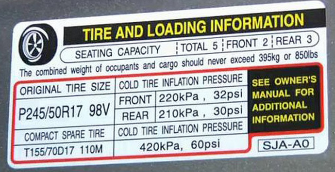 유럽권 국가에서 생산된 차량의 경우 차량의 적정 공기압을 승차 인원에 따라 구체적으로 표기하기도 합니다. 5인승 세단 기준으로 운전자가 2인 승차 시와 5인 승차 시의 공기압을 달리하도록 승차 인원에 따른 권장 공기압을 알려줍니다.