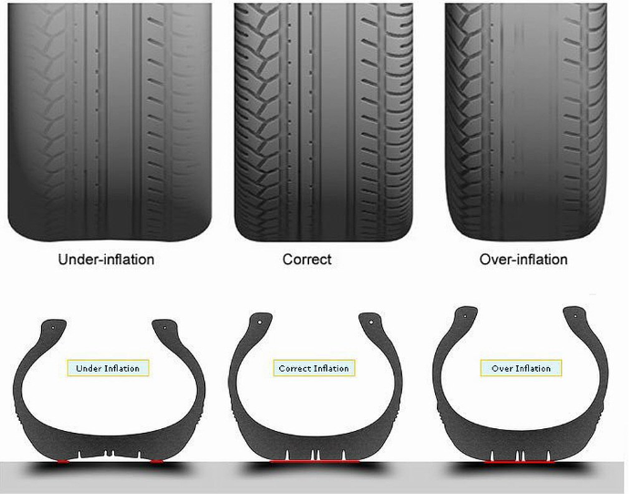 타이어 공기압은 눈으로 보는 것만으로도 기본적인 점검이 가능합니다. 평지에 주차해 놨을 때 4개의 타이어가 지면과 닿는 부분을 살펴보면 공기압이 적은 타이어는 차의 무게에 눌려 지면 쪽 사이드윌이 불룩하게 나오게 됩니다.