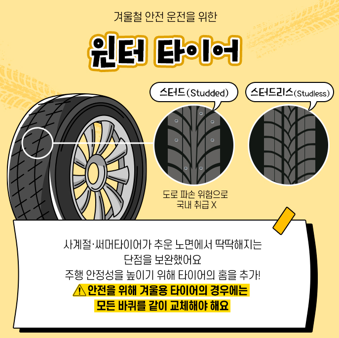 윈터 타이어는 겨울철 안전 운전을 위한 타이어입니다. 사계절·써머 타이어가 추운 노면에서 딱딱해지는 단점을 보완했다고 합니다. 주행 안전성을 높이기 위해 타이어의 홈을 추가했다고 합니다. 안전을 위해 겨울용 타이어의 경우에는 모든 바퀴를 갈이 교체해야 한다고 합니다.