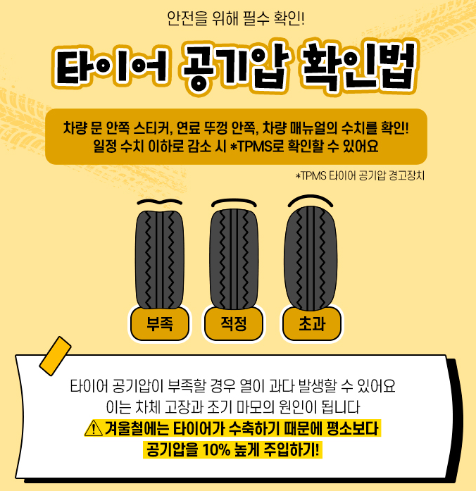 타이어 공기압이 부족할 경우 열이 과다 발생할 수 있다고 합니다. 이는 차체 고장과 마모의 원인이 된다고 합니다. 그리고, 겨울철에는 타이어가 수축하기 때문에 평소보다 공기압을 10% 높게 주입하는 것이 좋다고 합니다.