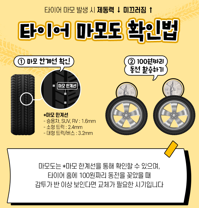 타이어 마모 발생 시 제동력이 떨어지고 미끄럼 발생이 늘어난다고 합니다. 마모는 마모 한계선을 통해 확인할 수 있으며, 타이어 홈에 100원짜리 동전을 꽂았을 때 감투가 반 이상 보인다면 교체가 필요한 시기를 의미한다고 합니다.