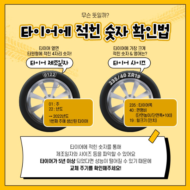 타이어가 5년 이상 되었다면 성능이 떨어질 수 있기 때문에 교체 주기를 확인해야합니다.