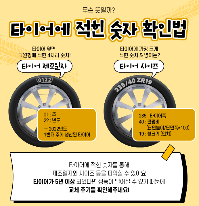 타이어에 적힌 숫자는 어떤 뜻을 의미할까요? 타이어 옆면 타원형에 적힌 4자리 숫자는 타이어 제조일자를 의미하고, 타이어에 가장 크게 적힌 숫자와 영어는 타이어 사이즈를 의미한다고 합니다. 그래서, 타이어에 적힌 숫자를 통해 제조일자와 사이즈 등을 파악할 수 있다고 합니다. 타이어가 5년 이상 되었다면 성능이 떨어질 수 있기 때문에 교체 주기를 확인해주어야 한다고 합니다.