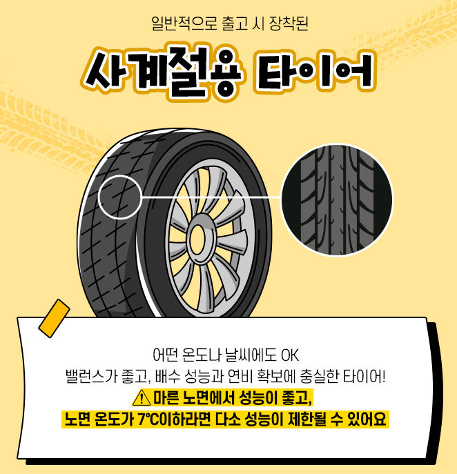사계절용 타이어는 일반적으로 출고 시 장착된 타이어입니다. 어떤 온도나 날씨에도 좋으며, 밸런스가 좋고, 배수 성능과 연비 확보에 충실한 타이어라고 볼 수 있습니다. 사계절용 타이어는 마른 노면에서 성능이 좋고, 노면 온도가 7℃ 이하라면 다소 성능이 제한될 수 있다고 합니다.