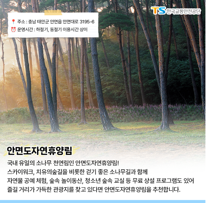 국내 유일의 소나무천연림인 안면도자연휴양림은 스카이워크, 치유의 숲길을 비롯한 걷기 좋은 소나무길과 함께 자연물 공예 체험, 숲속 놀이동산, 청소년 숲속 교실 등 무료 상설 프로그램도 있어 즐길 거리가 가득한 관광지를 찾고 있다면 안면도자연휴양림을 추천합니다.