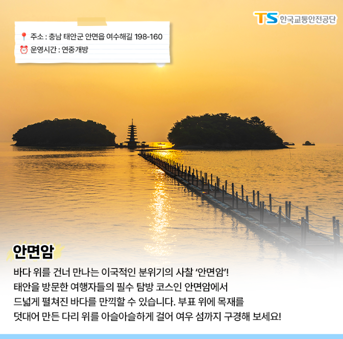 바다 위를 건너 만나는 이국적인 분위기의 사찰 '안면암'은 태안을 방문한 여행자들의 필수 탐방 코스로 안면암에서 드넓게 펼쳐진 바다를 만끽할 수 있습니다. 부표 위에 목재를 덧대어 만든 다리 위를 아슬아슬하게 걸어 여우 섬까지 구경하면 좋습니다.