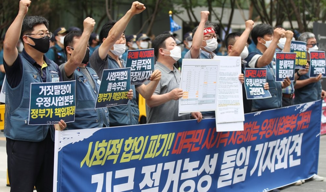 노조는 이날 오후 1시께 포스트타워 앞에서 긴급 기자회견을 열고 국가 공공기관인 우정사업본부가 사회적 합의의 최대의 걸림돌이 되고 있다고 비판했다고 합니다.