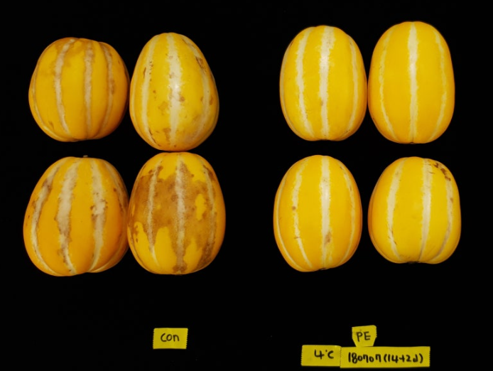 참외도 아무것도 처리하지 않고 저온 보관한 것보다 비닐 필름으로 포장한 뒤 저온에 둔 시험구에서 노란색 껍질과 골 부분(하얀 줄 부분)의 갈변 증상이 덜 발생해 상품화 가능 비율이 47% 증가했다고 합니다.
