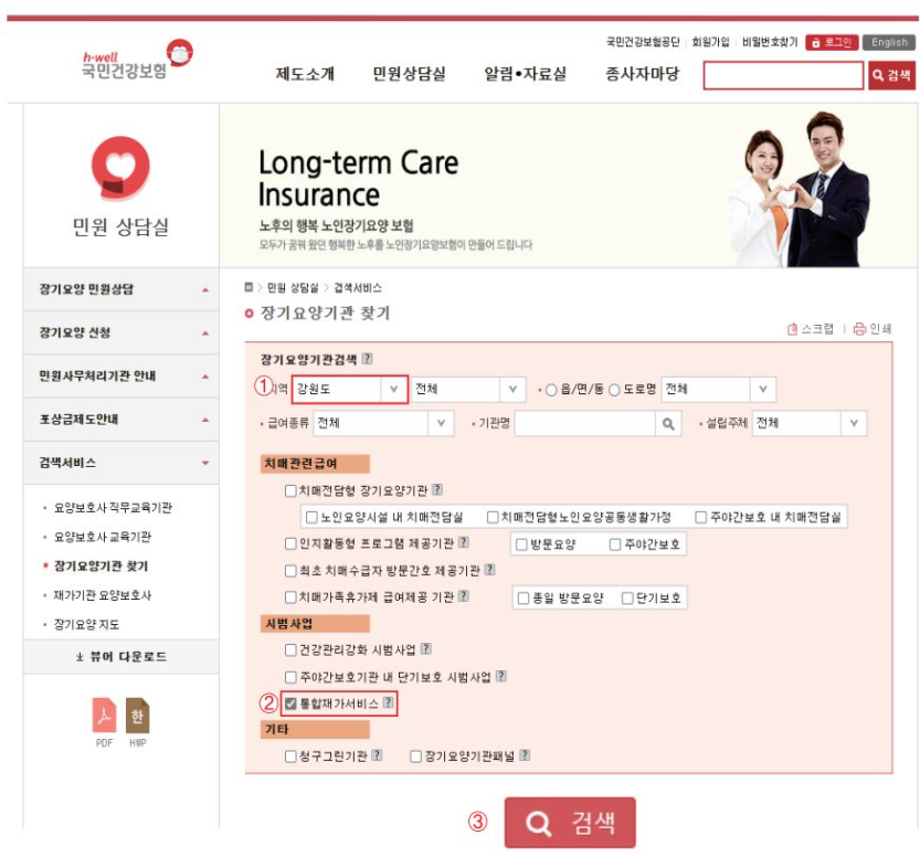 노인장기요양보험 홈페이지 ▶ 민원상담실 ▶ 검색서비스 ▶ 장기요양기관 찾기