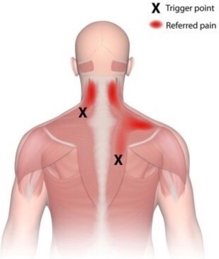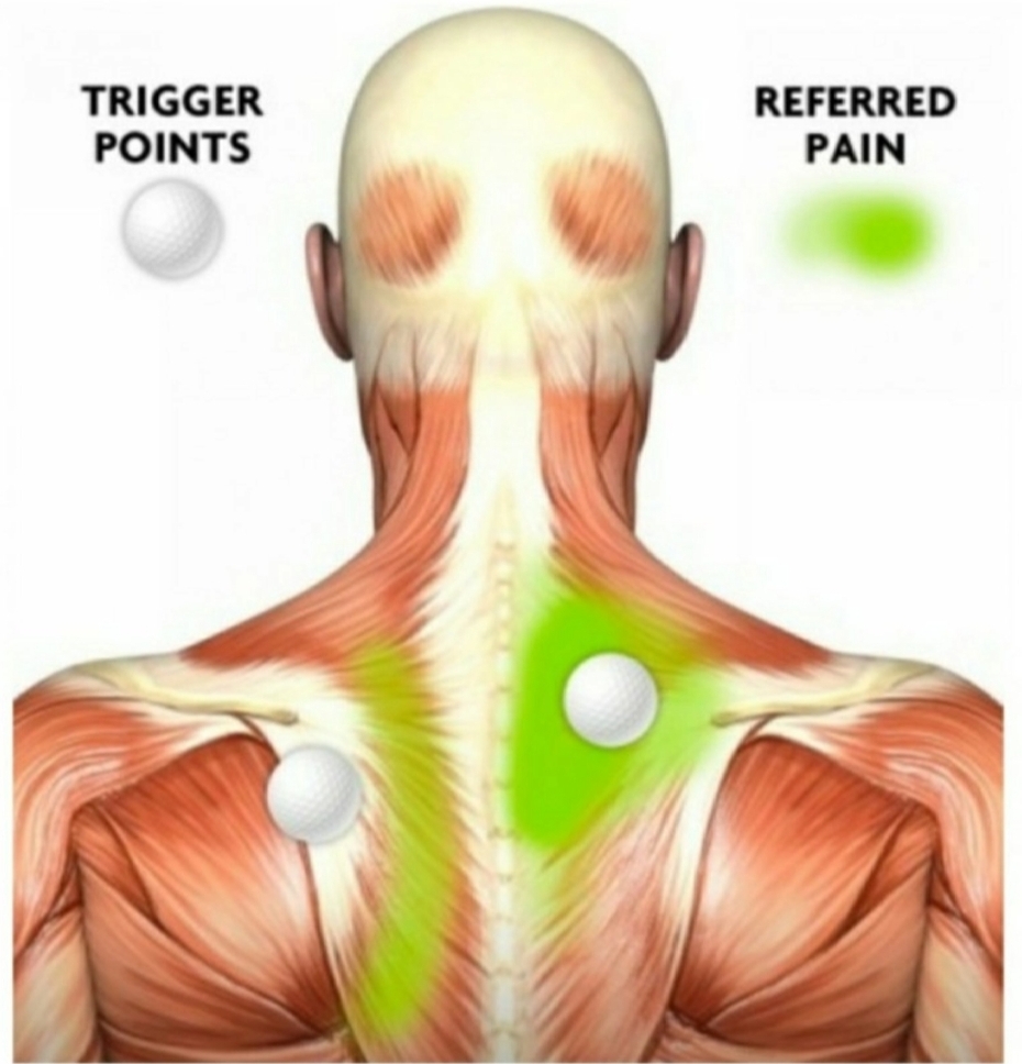 예를 들어 근육이 가장 잘 뭉치는 어깨에 트리거포인트가 생겼다면 그 부위만 아픈게 아니라 팔, 머리, 혹은 다리까지도 통증이 생길 수 있다고 합니다.