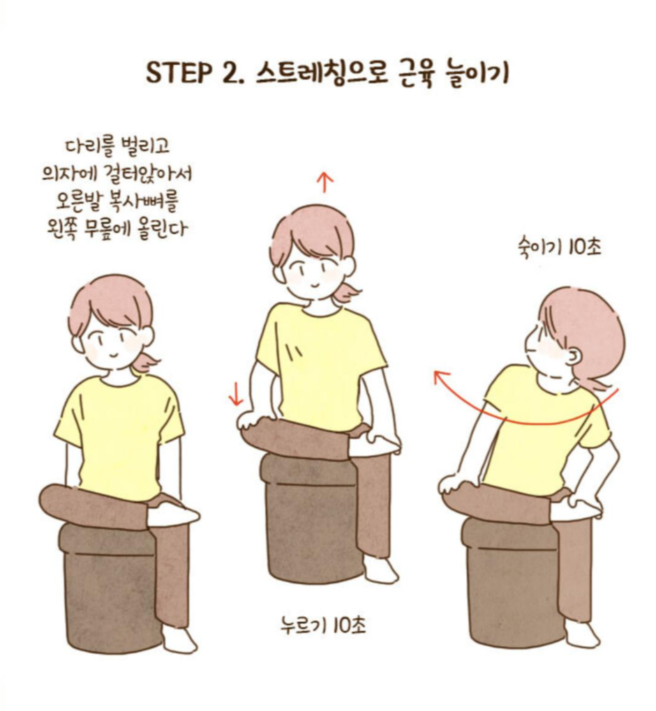 그림과 같이 다리를 벌리고 의자에 걸터앉아서 오른발 복사뼈를 왼쪽 무릎에 올린후 10초간 누르고 반대쪽으로 10초간 숙이는 스트레칭을 하며 근육을 늘려보면 될것 같습니다.