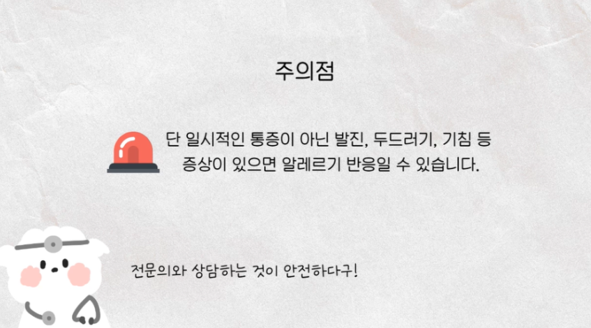 마지막으로 주의점을 알아보겠습니다. 과일을 먹고 일시적인 통증이 아닌 발전, 두드러기, 기침 등의 증상이 있으면 알레르기 반응일 수 있으니 병원에 가는 것이 좋다고 합니다.