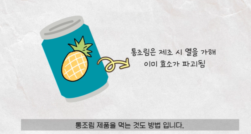 과일에 열을 가하면 효소가 분해되기 때문에 먹어도 아프지 않다고 합니다. 또한 통조림 제품을 먹는 것도 방법이라고 합니다. (통조림은 제조 시 열을 가해 이미 효소가 파괴됨)
